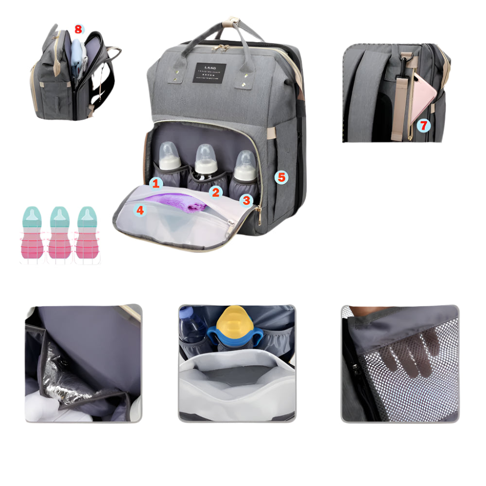 מהיום לא צריך לבחור בין סטייל לנוחות! תיק גב אלגנטי שמתאים לאמהות פעילות – כולל חלוקה חכמה לבקבוקים, חיתולים ומוצרים, וגם נפתח למיטה מתקפלת ונוחה לקטנטן שלך – בכל מקום ובכל זמן.